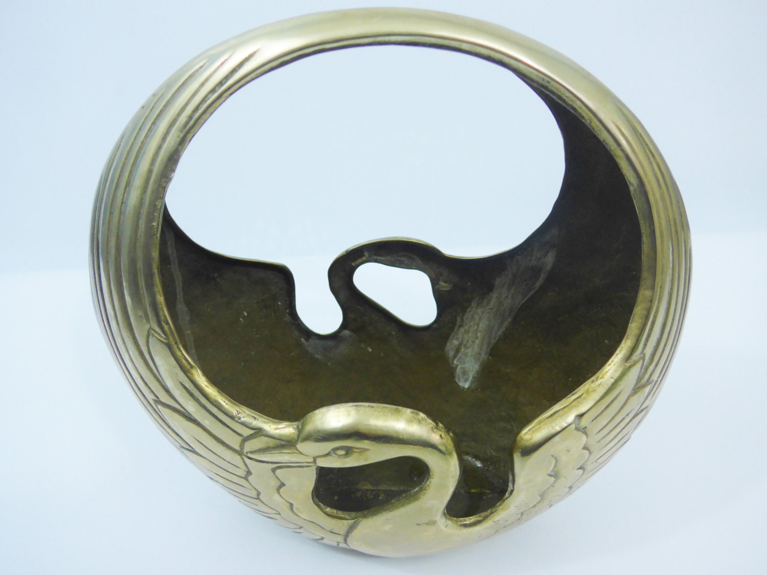 Vintage Solid Brass Swan Planter Circular Planter Large W Bird Motif Egret Or Swan On Both Sides Home Decor